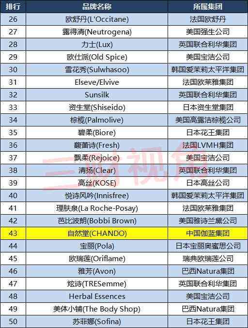施华蔻排名第24,Natura排名第25;欧舒丹排名第26,露得清排名第27;