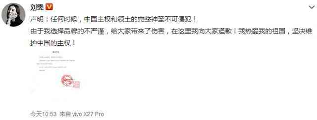 12日上午,人称“大表姐”的蔻驰中国区品牌代言人、超模刘雯就在微博上发表声明称:“由于我选择品牌的不严谨,给大家带来了伤害,在这里我向大家道歉!……任何时候,中国主权和领土的完整神圣不可侵犯!”