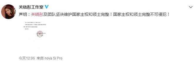 12日中午,关晓彤工作室发布同样发布声明:“目前,我司艺人关晓彤与Coach品牌已无合作,关晓彤及团队始终坚持一个中国原则。”