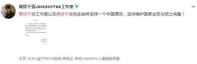 另一方面,纪梵希也在易烊千玺的解约声明曝出后不久,发出了道歉声明,表示“坚决拥护一个中国原则”。