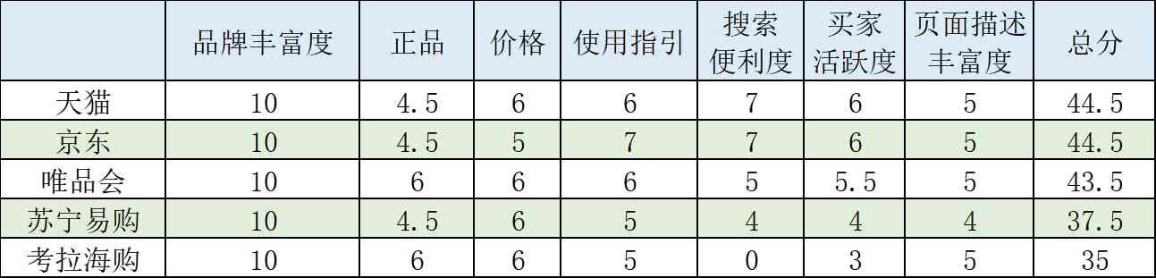 总评分显示,天猫、京东、唯品会平台并列综合排名.,苏宁易购平台在五家测评的平台中排名最后。售前信息维度中,天猫和京东表现较好,考拉海购得分较低。售后服务维度中,各平台差距不大,苏宁易购排名最后。客服维度中,唯品会表现最佳,苏宁易购垫底。