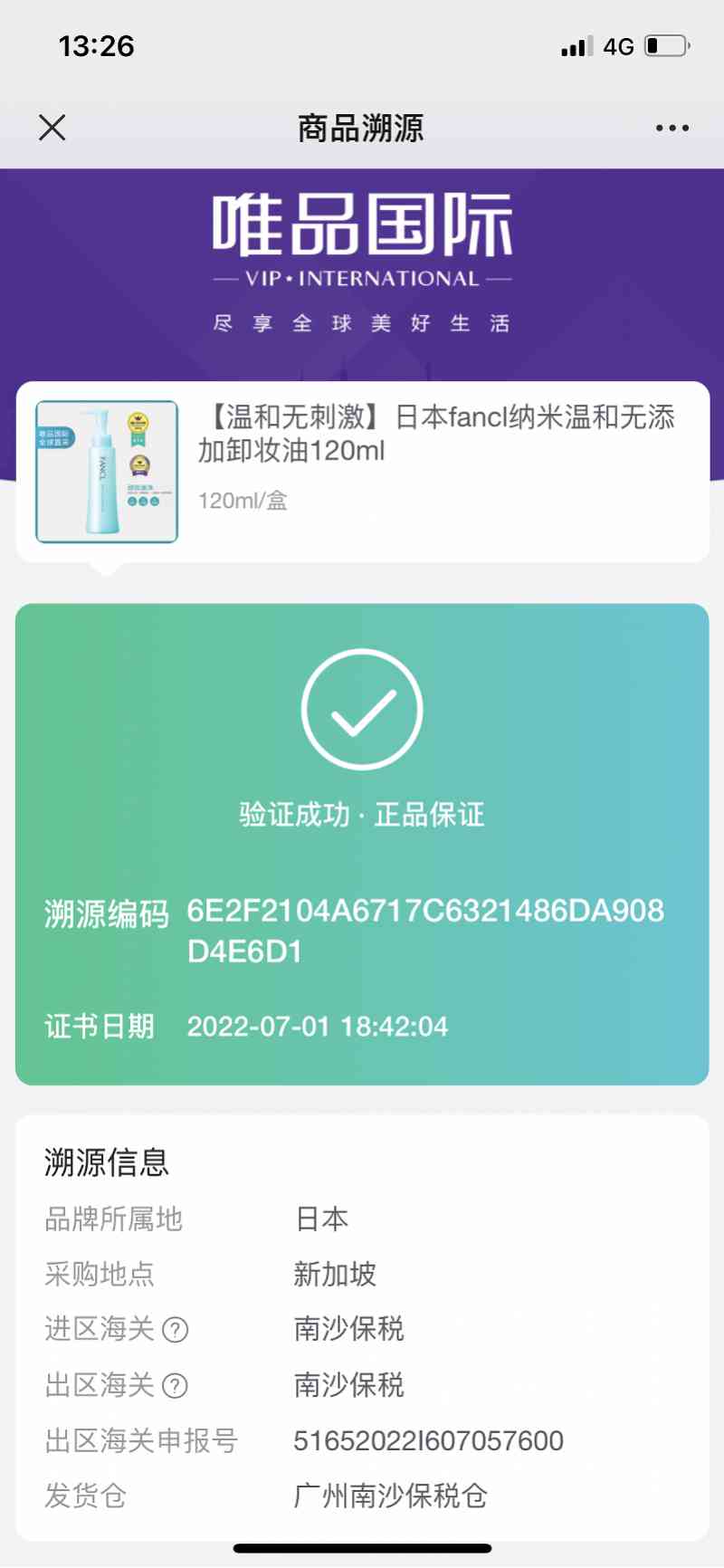 唯品会显示在购买海淘产品Fancl卸妆油之后,找溯源二维码、输入刮开可见的六位溯源码之后,可以看到相关商品是从新加坡采购、并经南沙保税仓入境的。