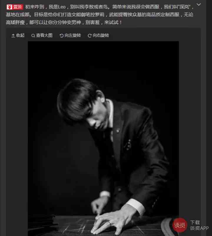 不过他有傲娇的资本,据说今年全成都最流行的深蓝系西服就从他这儿出来的,然后大家都在抄他。