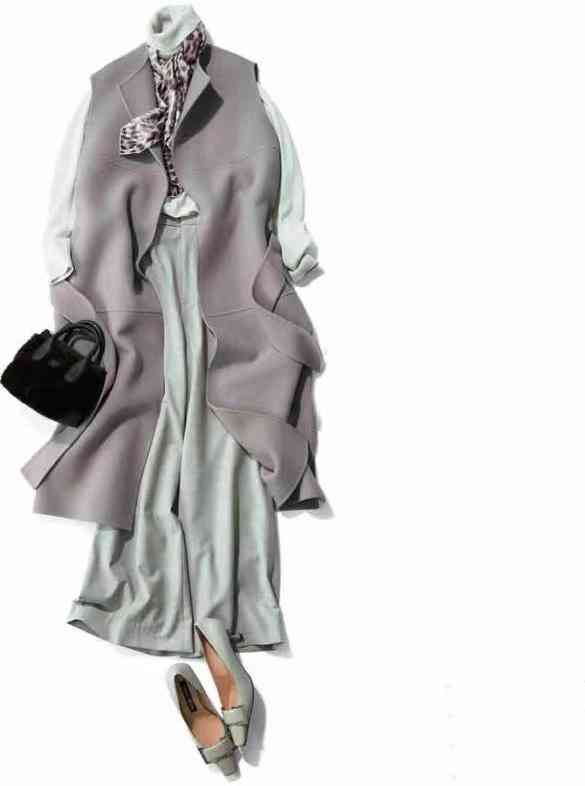 浅灰+粉灰:不需多,一点点淡粉或淡米介入,就能让一件灰色大衣焕发新颖的时尚落脚点。长马甲也行,少了两条袖管更灵活。