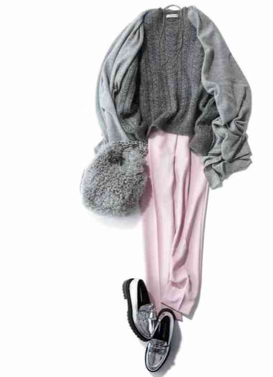搭配深灰色大毛衣,浅灰薄外套或者大披肩点缀,层次栩栩如生。为了与粉色更呼应,灰色毛毛包包与项链点缀,于无声中制造大气意境。
