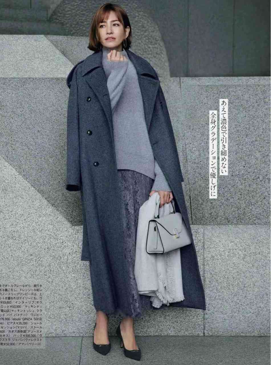 下面搭配,就是对这2点的诠释。深灰外套、中灰毛衣、浅灰阔腿裤的一气呵成,少了银灰色包包与黑色高跟鞋,怎能有看点?