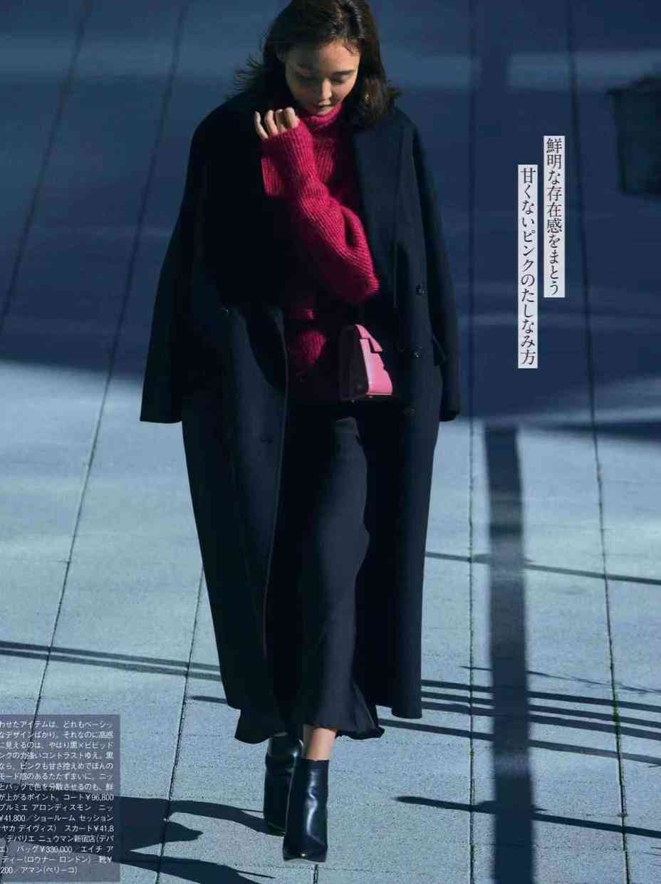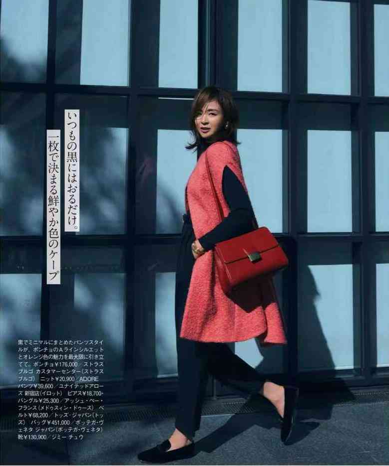 内搭黑色同色系,故意露出脚踝,用肤色呼应鲜艳色,整个细节更完美。红色包包与橙红色马甲的色调差异,处理得巧妙极了。