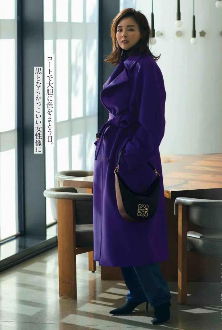 这件紫色大衣,醒目华贵,内搭黑色毛衣与休闲牛仔裤,算是一道最优解。悄悄告诉你:吃不准时,选牛仔裤准没错!