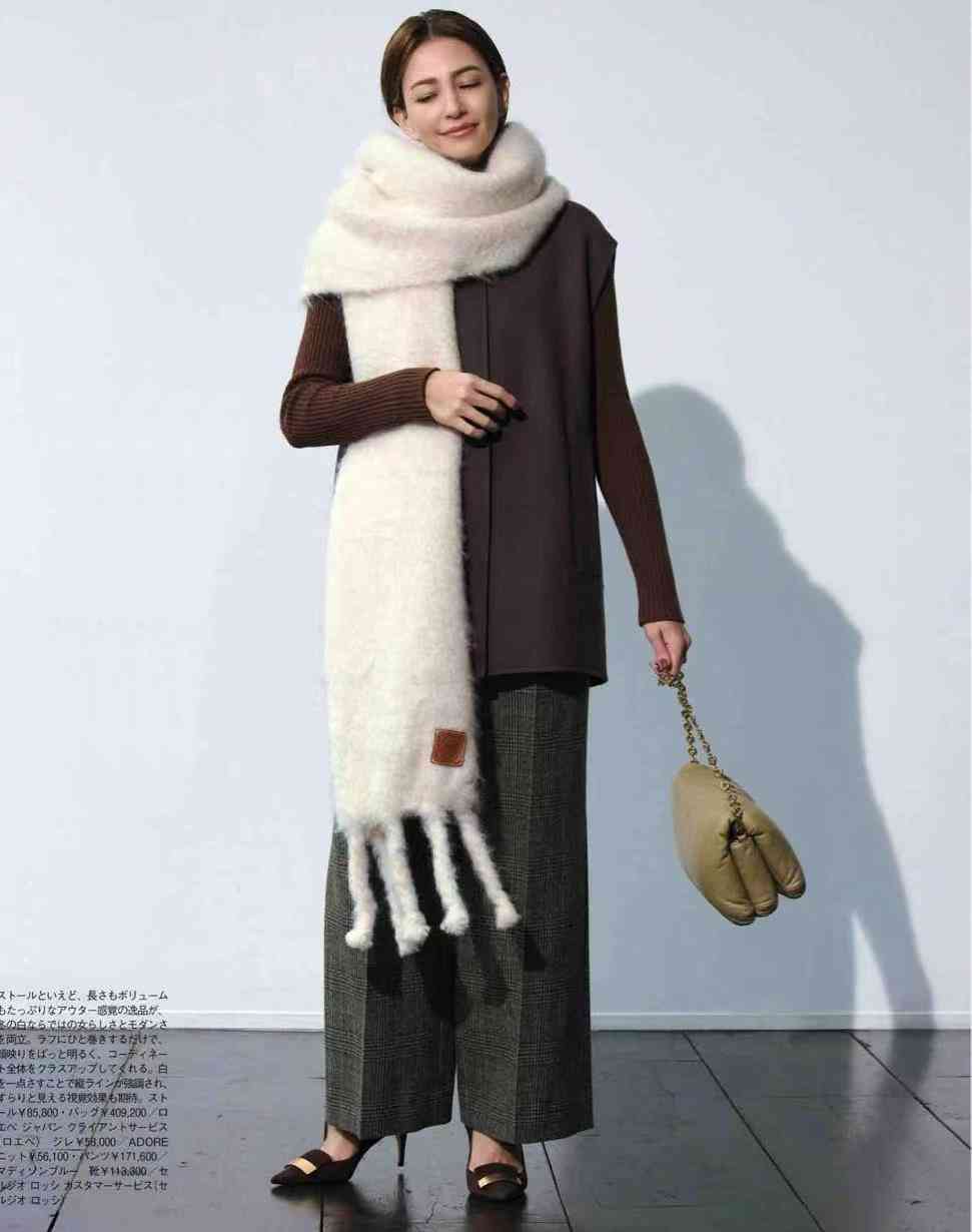 这套棕褐配,米白大围巾的时髦点缀,功不可没。