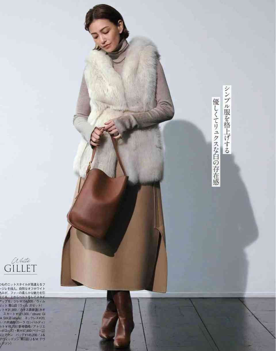 皮草马甲的上乘质感,白色最能体现。选择淡雅柔和的米白色,等于为质感加了一层保护色。内搭米色针织衫,选择棕色半裙表达轻奢贵气。