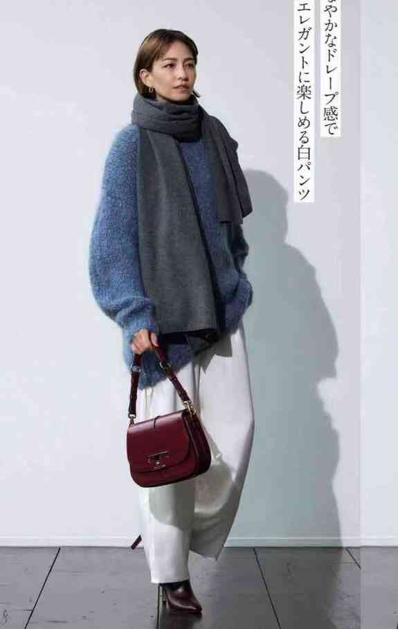 一条白裤子,凭借干练独当一面。锥形裤、阔腿裤不限,冬天穿它,直接质感晋级。搭配灰蓝色大毛衣,配一条深灰色围巾,随便穿就是洒脱风景。