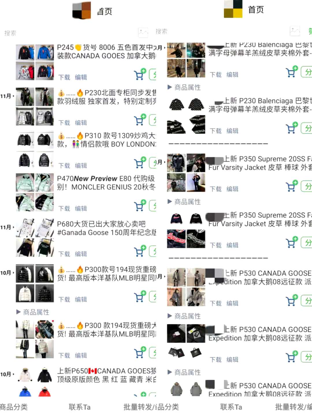 这些店铺的服装都是“大牌”,少则几十元一件,贵的几百元一件。除了Nike、Adidas等运动品牌,还有Canada Goose(加拿大鹅)、Burberry(博柏利)等高端甚至奢侈品牌,应有尽有。