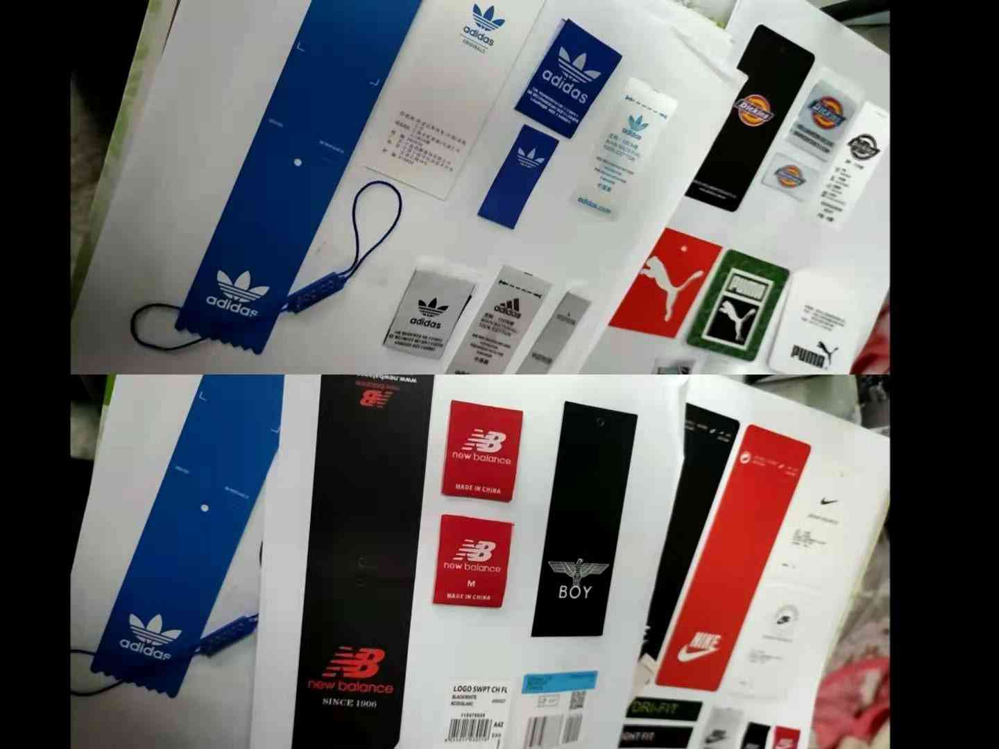 商海路附近的小商品市场也是服装辅料店的聚集区。一家沿街店铺的老板娘拿出一袋Champion(冠军)的织标,称“要的话可以直接拿走”。她随后又取出一本带有不同品牌的全套印标的样品册,包括Adidas、Puma(彪马)、Dickies(迪凯斯)、New Balance(新百伦)、Nike等品牌。“一套完整的领标、水洗标、吊牌,1块钱左右。”