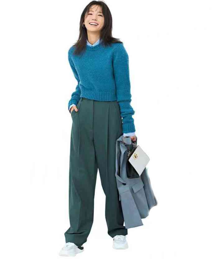 海水蓝色毛衣,内搭浅蓝衬衫,下配绿色阔腿裤,延绵起同色浪漫。小白鞋与领口浅蓝呼应,灰色西服依傍,全凭配色出彩。