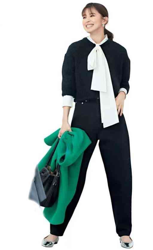 黑毛衣搭配黑裤子,人人都会穿。可懂得突破单一沉闷的时髦精并不太多。内搭白色飘带衬衫,大量感招摇的系带,用其无比浮夸的华丽为一身黑注入浪漫。