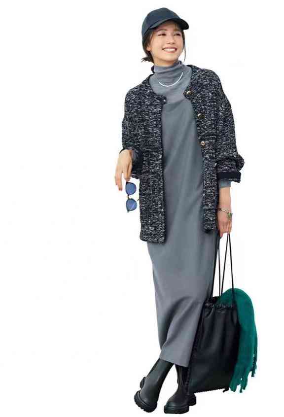 黑灰的花呢外套,中性>端庄。于是,内搭直筒吊带裙,配一双切尔西短靴,利用大气灰的美名,为造型增添光彩。