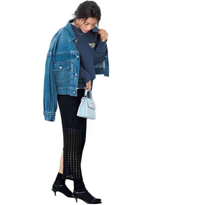 黑色缕空直筒裙,妩媚且妖娆。与牛仔外套、休闲卫衣的混搭,中和性感,又酷又美。原本是黑色凉鞋,叠穿袜子后直接化身短靴效果。