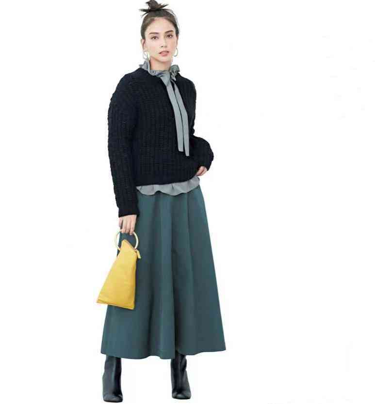 黑色毛衣配伞裙,端庄大气,还有丝丝浪漫氤氲。为了制造完美的层次细节,内搭灰色系带衬衫,华丽领口、波浪下摆,提升美感氛围。