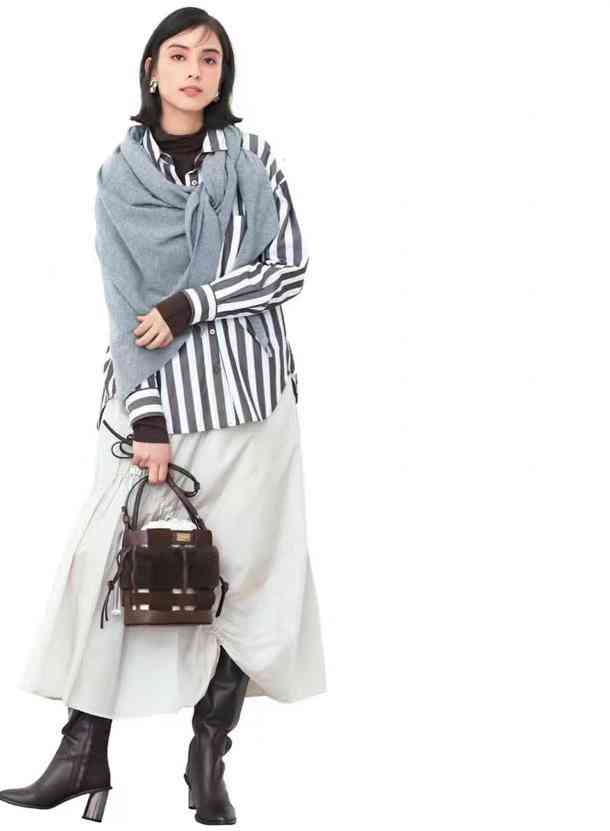 搭配半身裙与长筒靴,同色包包点缀,整个配色太和谐了。