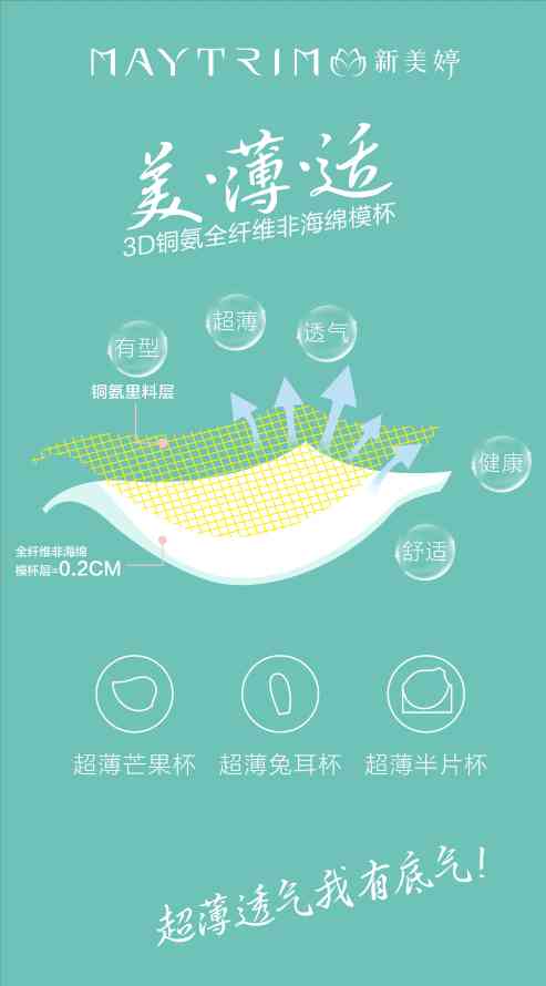 “健康美”是新美婷品牌的核心理念,主张以“看得见的轻薄”、“摸得到的柔软”、“感受得到透气”带来最佳的穿着感,呈现女性自然之美。“追求卓越,开拓创新”是其矢志不渝的坚守,不断根据当下的市场格局,借以源源不断的造血能力圈出自己的跑马场。以舒适、柔软的非海绵文胸在女性消费者心中树立起时尚健康的品牌形象。