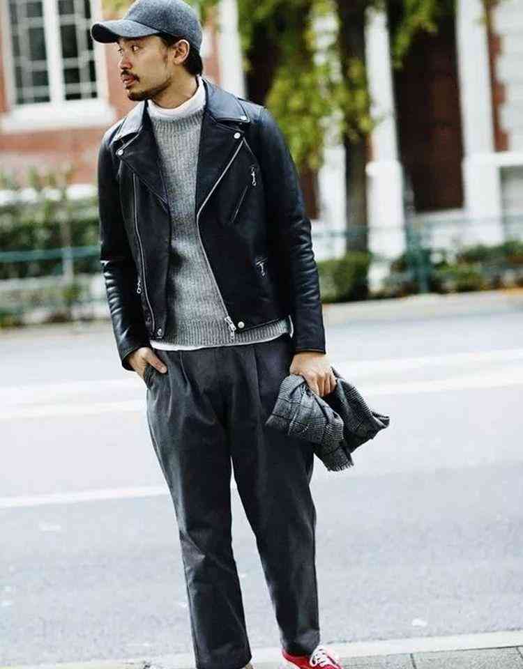 黑色皮夹克内搭灰色毛衣,内柔外刚强化造型层次,下半身搭配灰色休闲西裤和红色帆布鞋,佩戴棒球帽增添更多时髦元素。