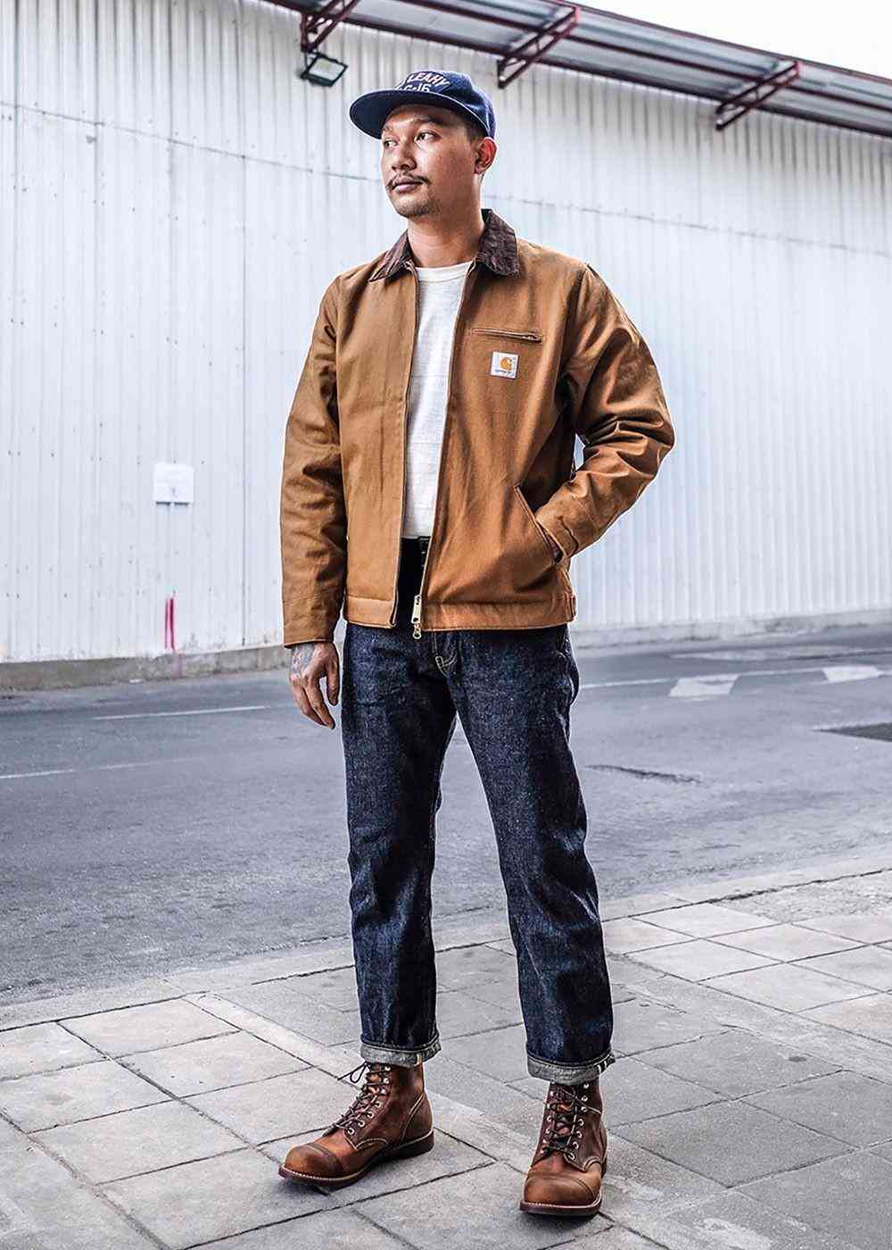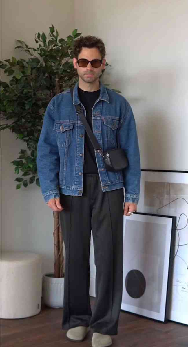 撞色穿搭其实对于不太会搭配的男士来说是非常有认可度的,黑色内搭做上装配上高腰黑色裤子,上下结构无缝衔接,小众的包包做点缀,配上牛仔外套没有180身高又何妨?照样帅得出众。