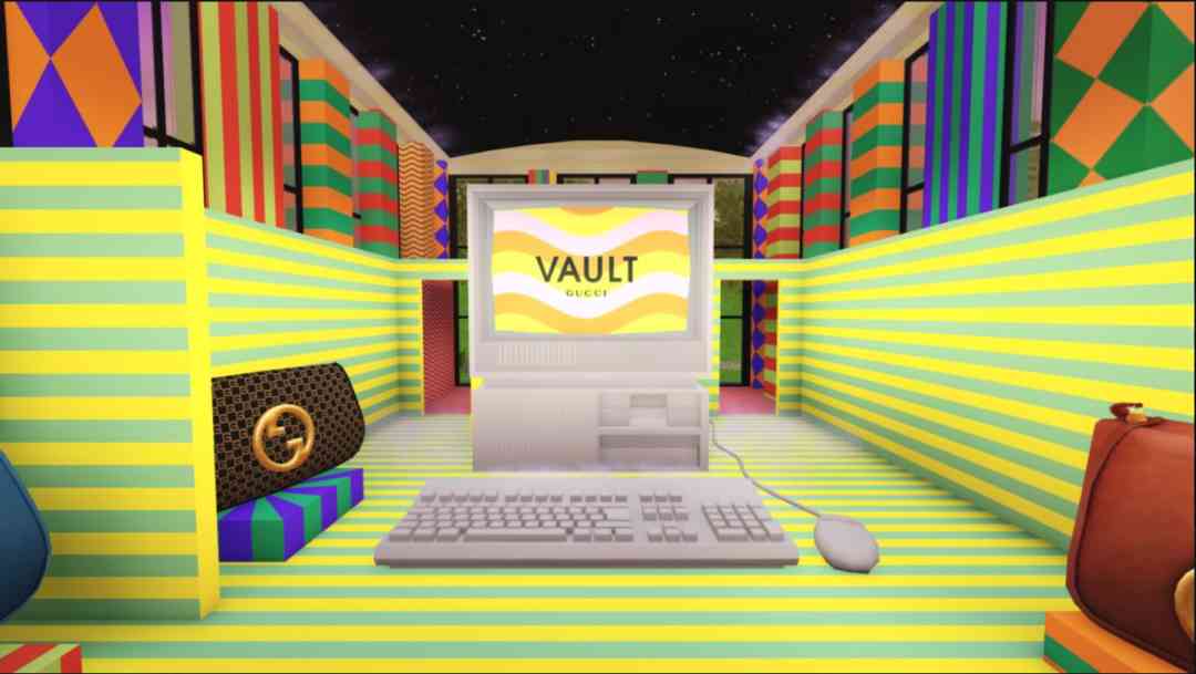 在小镇上,时装爱好者们最想打卡的还是藏宝阁广场(Vault Plaza)。虚拟时尚逐渐占领时装圈的这几年,Gucci也将藏宝阁建造成品牌的在线美学空间。
