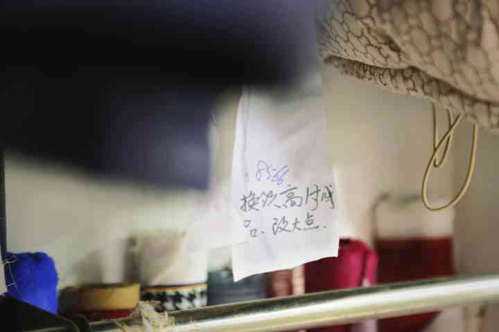 翻新的羽绒服上标注了顾客的需求(“换领高1寸成品,改大点”)