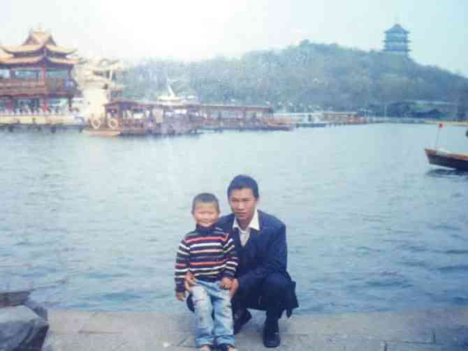 龙继东手机里存了不少儿子的照片,图为2005年前后,他和儿子在西湖边的合影。