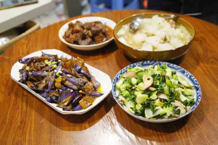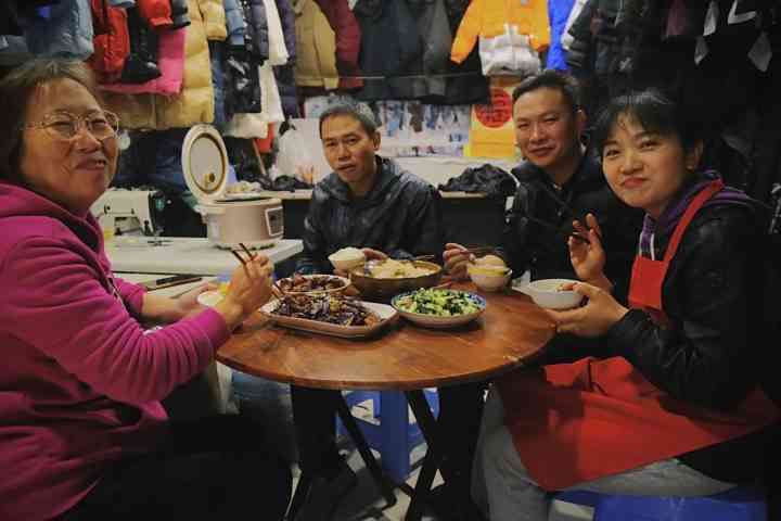 中午12点,张巨群从小店后面的厨房中走出,端上来热乎的饭菜,招呼大家过来吃饭。