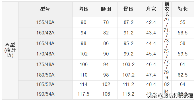 看过不少西服尺寸表,但总觉得有些欠缺,根据以往客户尺寸总结了5种不同版型(瘦身版、标准版、健壮版、舒适型、宽大型)男士西服尺码对照表,希望能帮助大家。