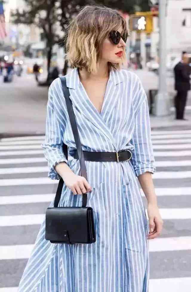 条纹衬衫裙,轻松休闲的同时,骨子里自带一份职场的利落与率性。一条腰带让它在洒脱与精致之间切换自如,毫无违和感。