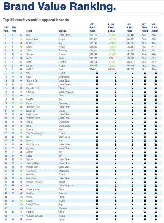 2022全球最有价值时尚品牌50强