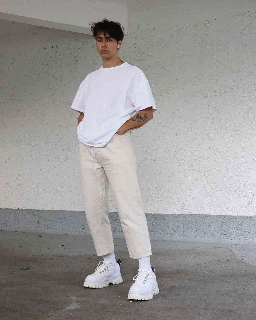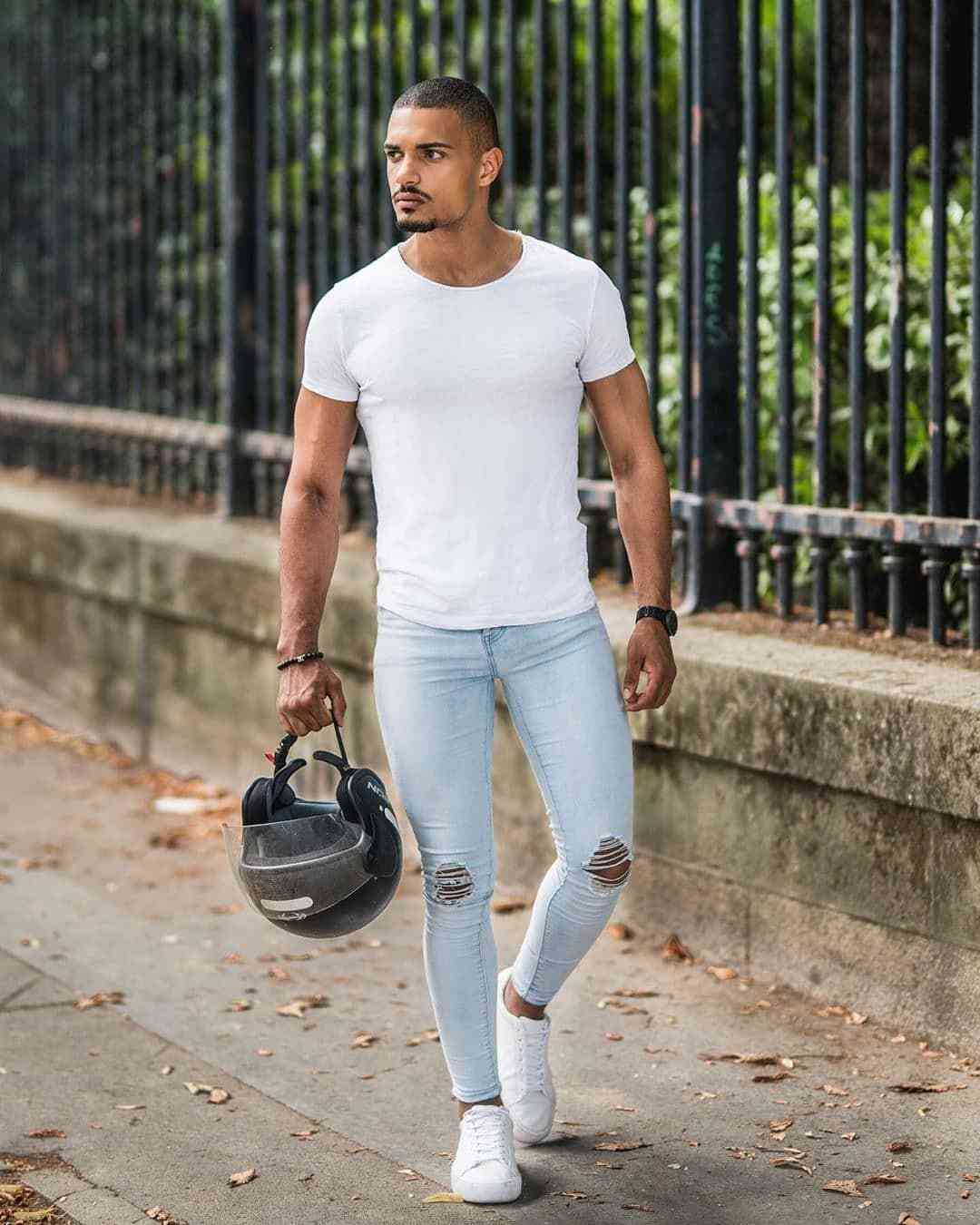 刚步入时尚圈的男士,在穿搭时别总是去追求一些高难度的搭配,不妨降低一下要求,选择一些款式和风格更百搭的单品,例如白色上衣,这样的服装简约又好搭,能够适应的人也多。