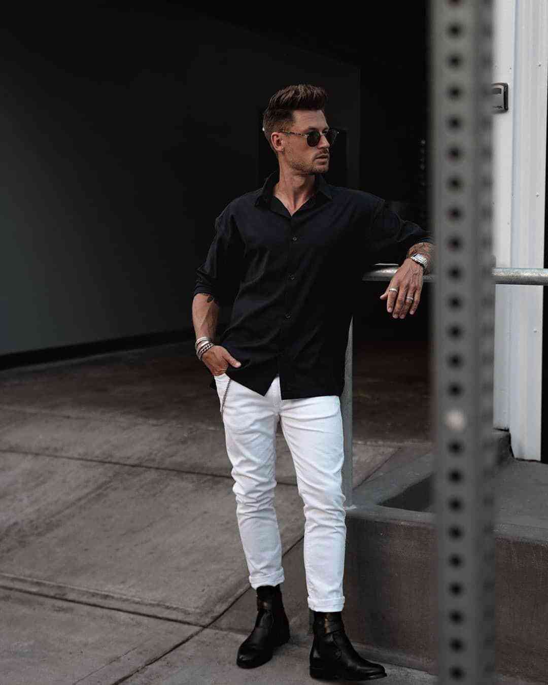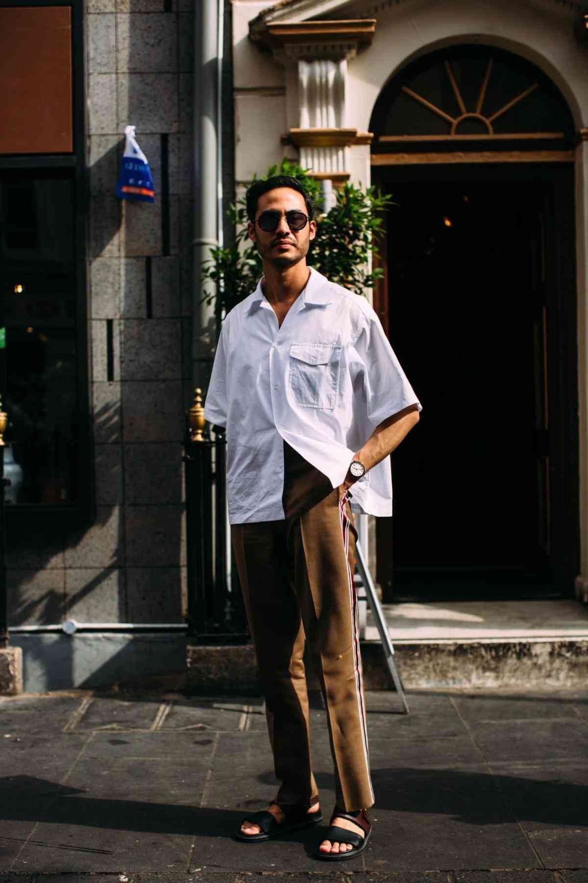 夏季里,除了选择T恤之外,这种白色衬衫也可以多穿。薄款衬衫高级又具备亮度,把随性的风格彰显得淋漓尽致,配一条高腰西裤帅得很霸气,男性魅力满满,值得借鉴和参考。