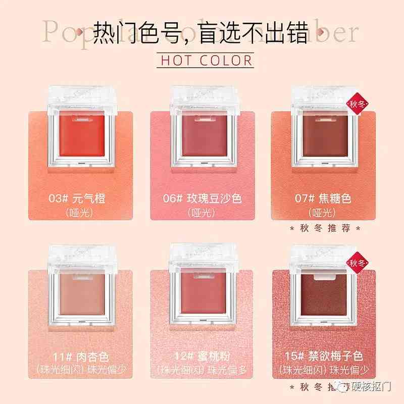 色号很多很齐全,满足你各种妆容搭配噢~这个腮红膏显色度很好,所以要注意控制用量。我是用手指或者打湿的美妆蛋轻轻的拍开,膏状质地会和自身的底妆融合的很好~有种从皮肤透出来的自然好气色~妙哇~