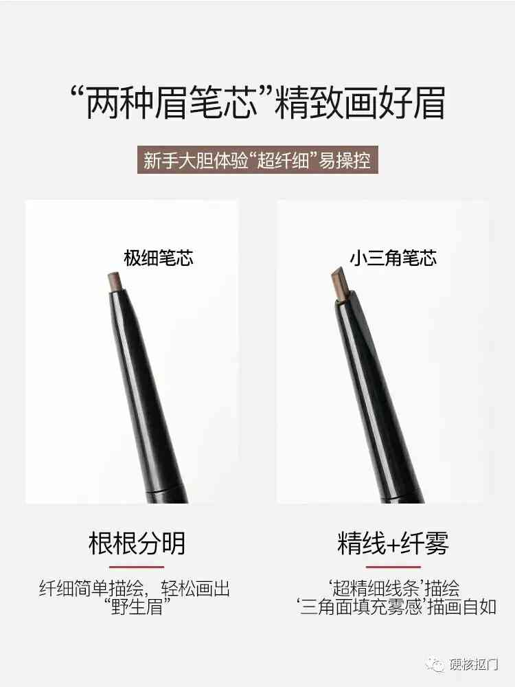 极细用来勾画野生眉,根根分明~三角头用来填色,画出来的眉毛是雾绒绒的~