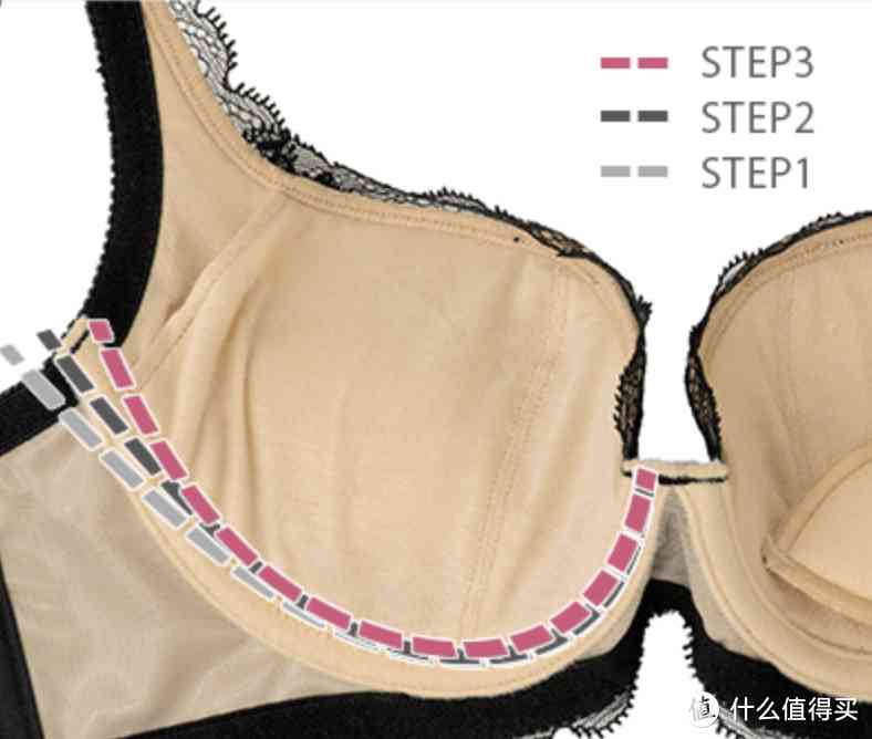第三阶段,杯里添加定型网纱设计,聚拢防外扩,棉质材料,柔软亲肤,下围钢圈进一步提升,稳固承托,抬高胸部,挺立丰杯。