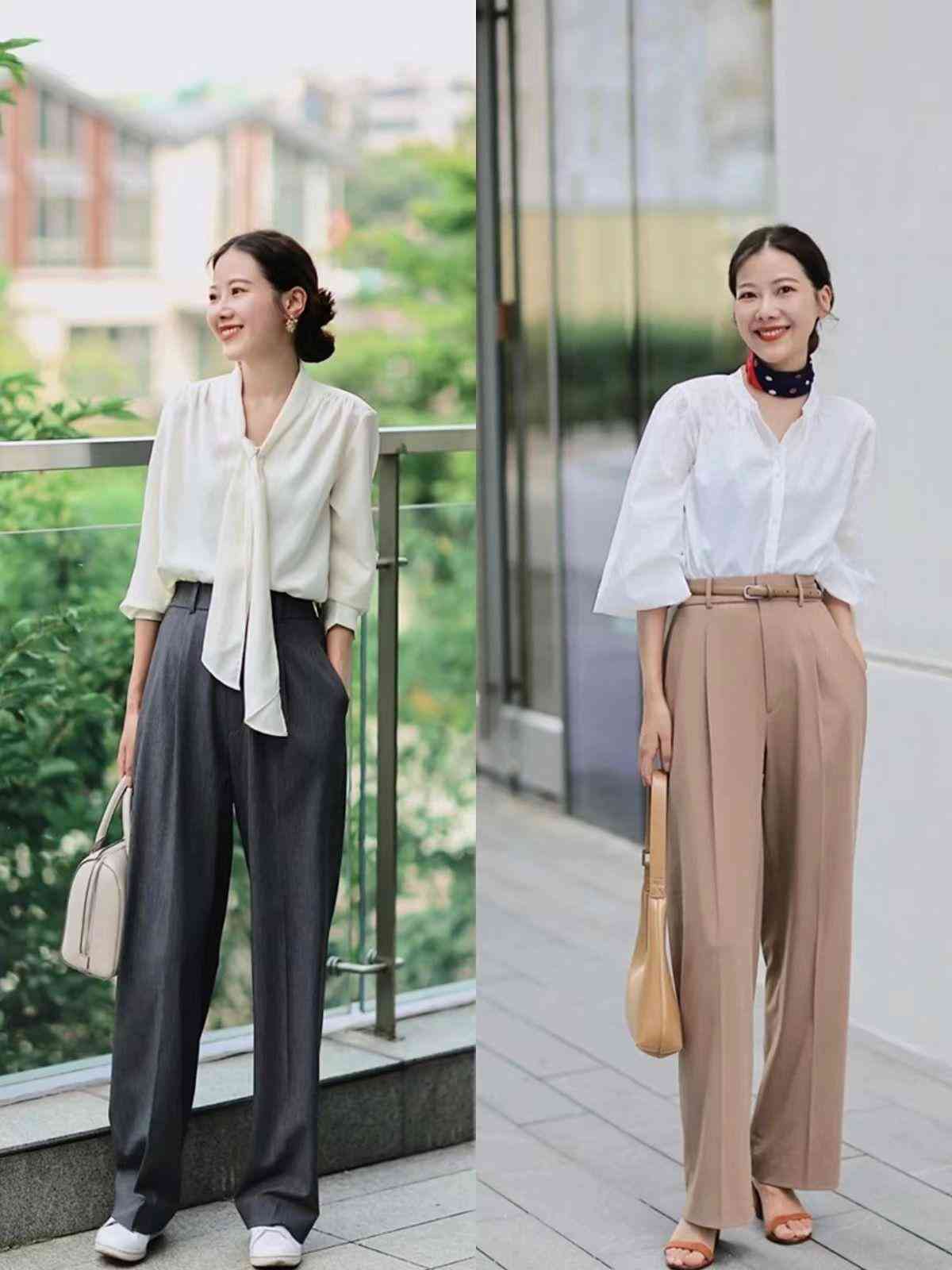 灰色、卡其色、咖色高腰西装阔腿裤都很适合我们,与衬衫的搭配优雅又正式,出街这样穿也很成熟大气。