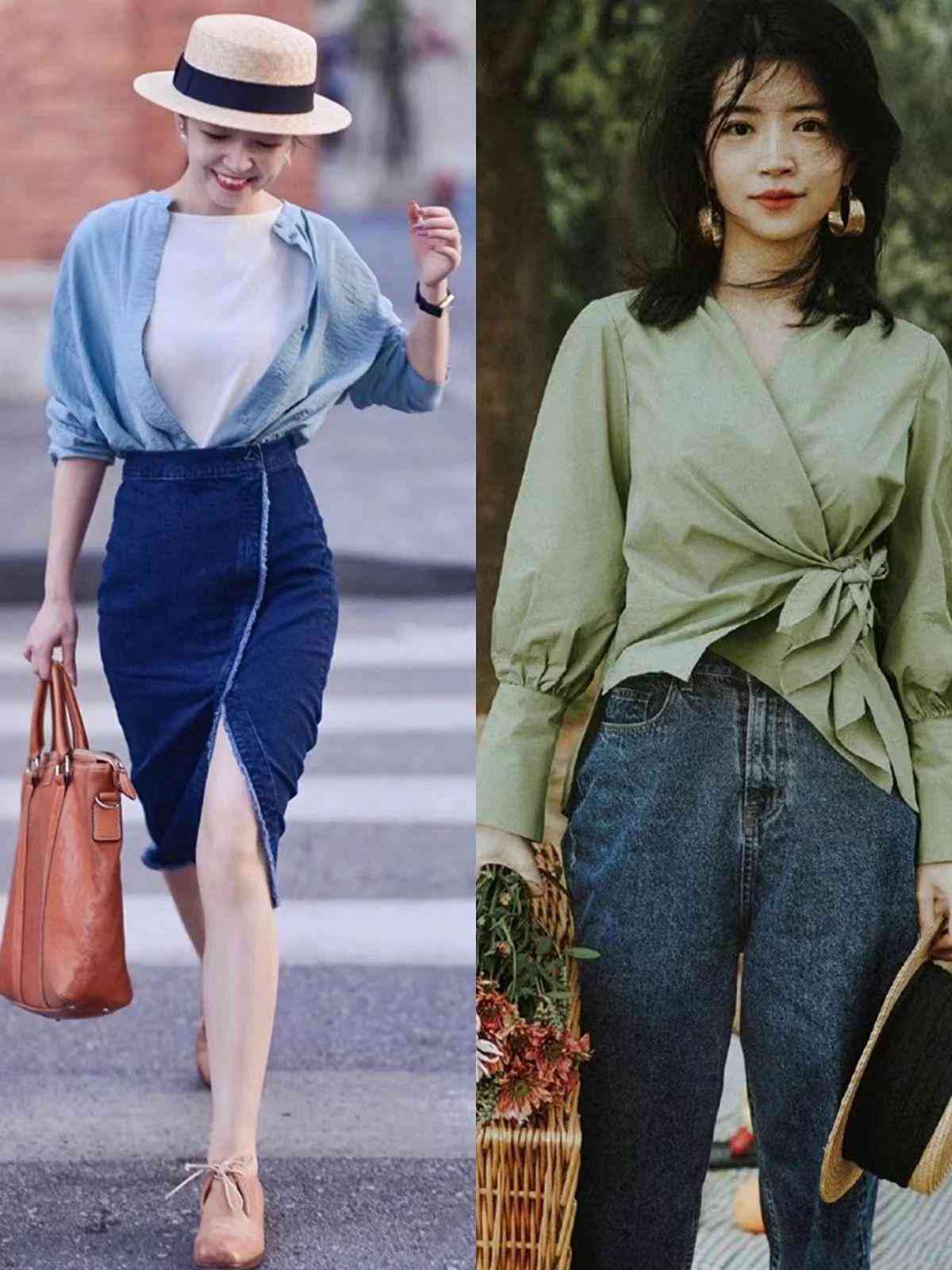 要么融入飘带设计、娃娃领设计或者一些古典设计,匹配蓝色牛仔裤,造型显得别具一格。
