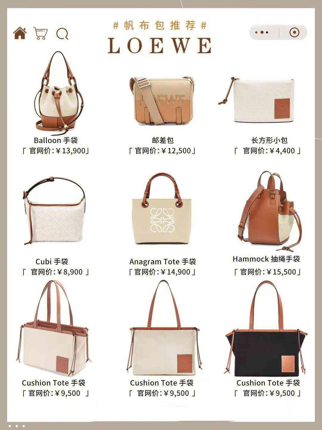 Loewe家的帆布包balloon手袋和hammock手袋是水桶包的变形,辨识度很高~cubi也叫饭盒包~