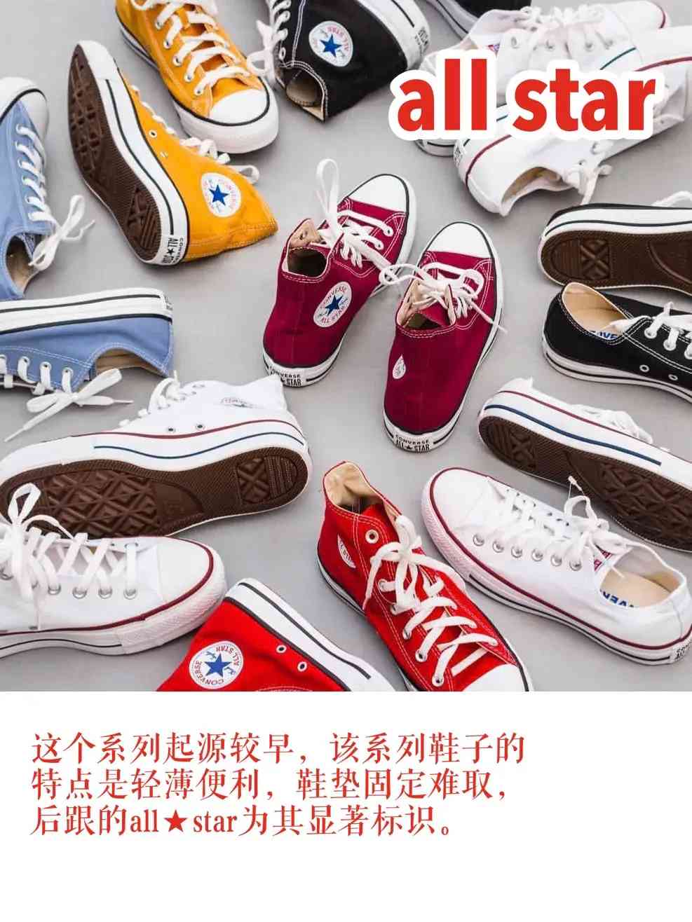 ① chuck taylor all star简称all star(全明星),这个系列由美国早期篮球特使匡威.个签约代言人chuck taylor(查克·泰勒)的名字命名,这个系列起源较早,该系列鞋子的特点是轻薄便利,鞋垫固定难取,后跟的all★star为其显著标识。常青款为这个系列代表,all star与常青款的关系也是母子关系,all star鞋子超多,而常青款主要是指常见的纯色那几款。