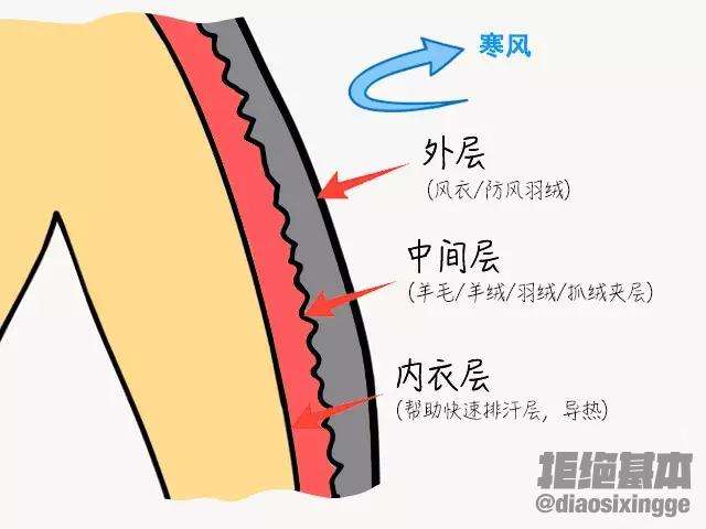 比如三明治穿衣法,分成三层,内层、中间层、外层。