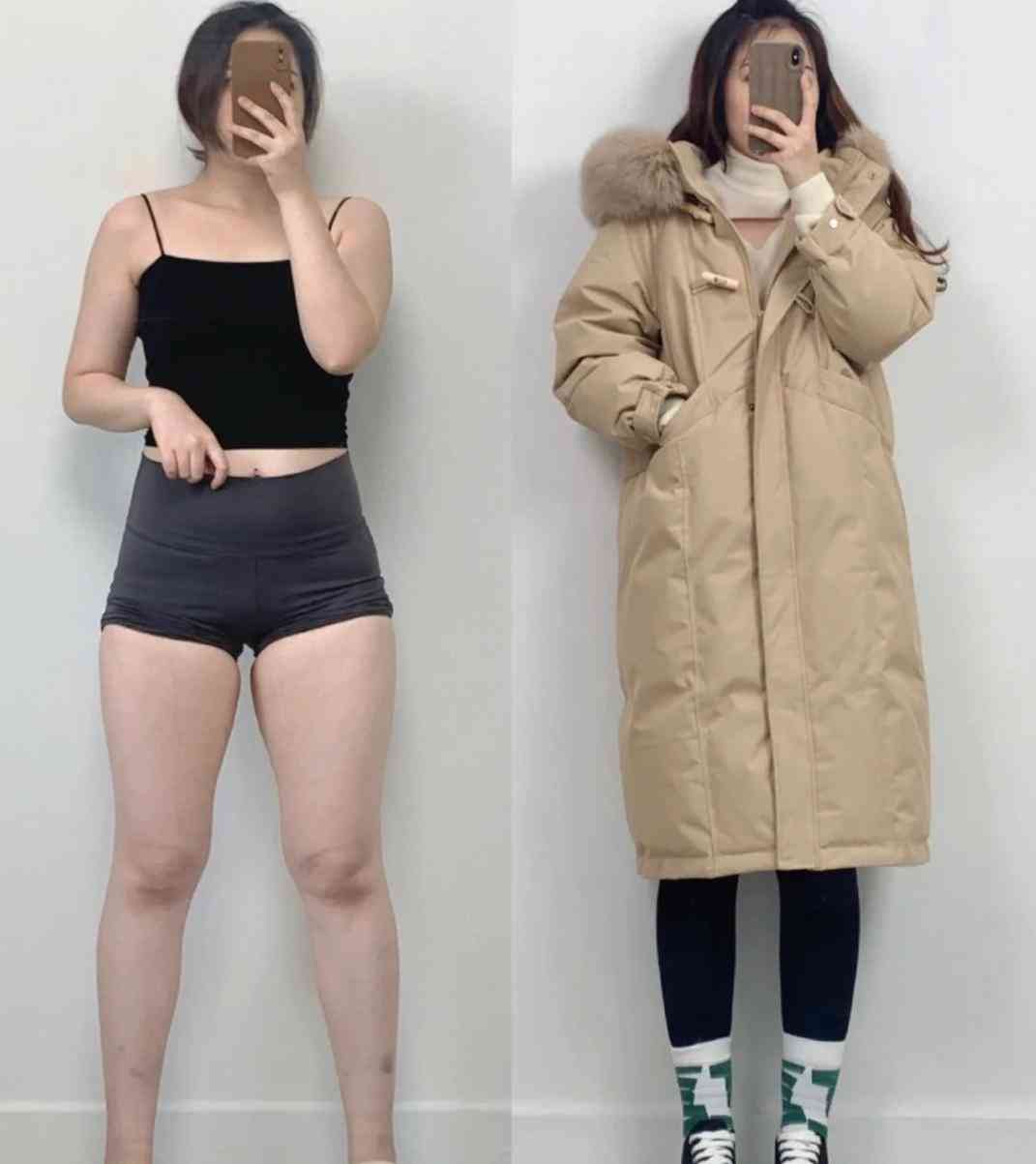 我觉得蓬松的长羽绒服、裤腿裤如果掌握不好很容易臃肿邋遢,尤其是身材不够高挑的姐妹,看下图: