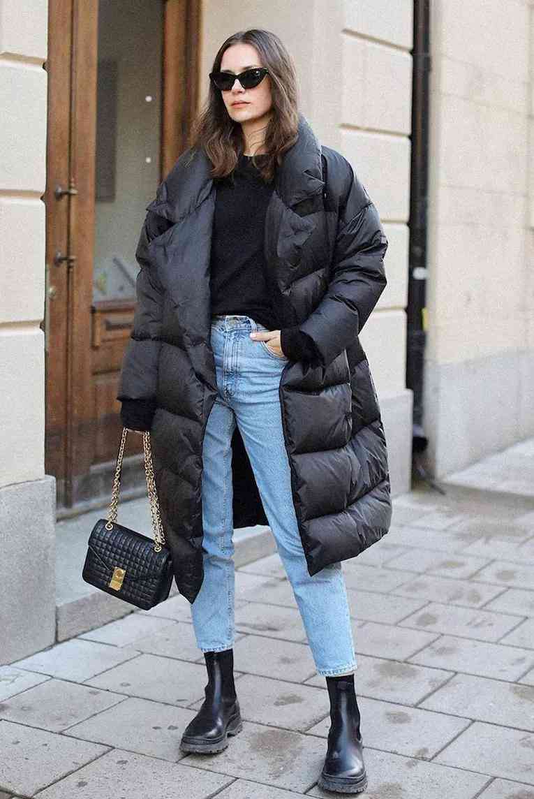 建议1:长羽绒服+紧身/修身裤