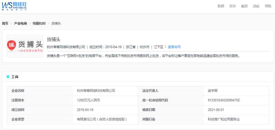 从网经社企业库(COP.100EC.CN)了解,货捕头所在的主体公司成都货捕头网络科技有限公司成立于2020年7月30日,法定代表人为翁宇辉。货捕头是一个”互联网+批发“的电商平台,将全国线下传统批发市场搬到网上批发,该平台称,让用户享受在家就能逛遍全国批发市场的服务。