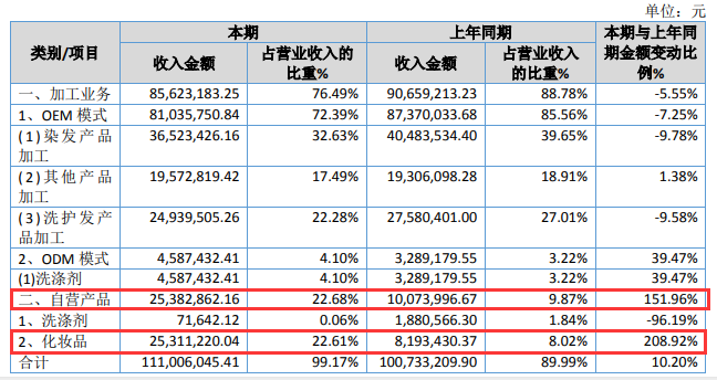 作为染发、洗护用品等产品代工商,美爱斯去年OEM/ODM业务营收8562.32万元,同比下降5.55%,由于染发、洗护发产品等OEM加工业务营收下滑,从而抵消了洗涤剂ODM加工业务39.47%的增长。除了加工业务外,据美爱斯官网显示,公司现拥有美爱斯化妆品、水乡丽人面贴膜、多爱洗涤品三大自有品牌。年报显示,该公司去年自营产品营收2538.29万元,增加151.96%,特别是化妆品收入占比最大,且增长了208.92%。