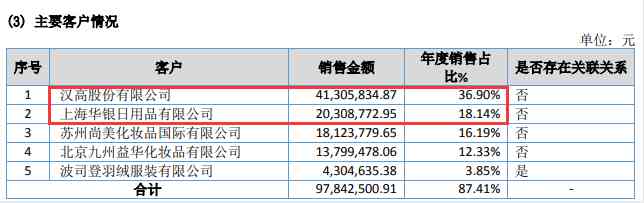 目前,汉高股份有限公司、上海华银日用品有限公司、苏州尚美化妆品国际有限公司等是美爱斯的前五大客户,总销售金额达9784.25万元,年度销售占比达到87.41%。其中仅汉高股份和上海华银日用品两家客户的销售额就占到50%以上。