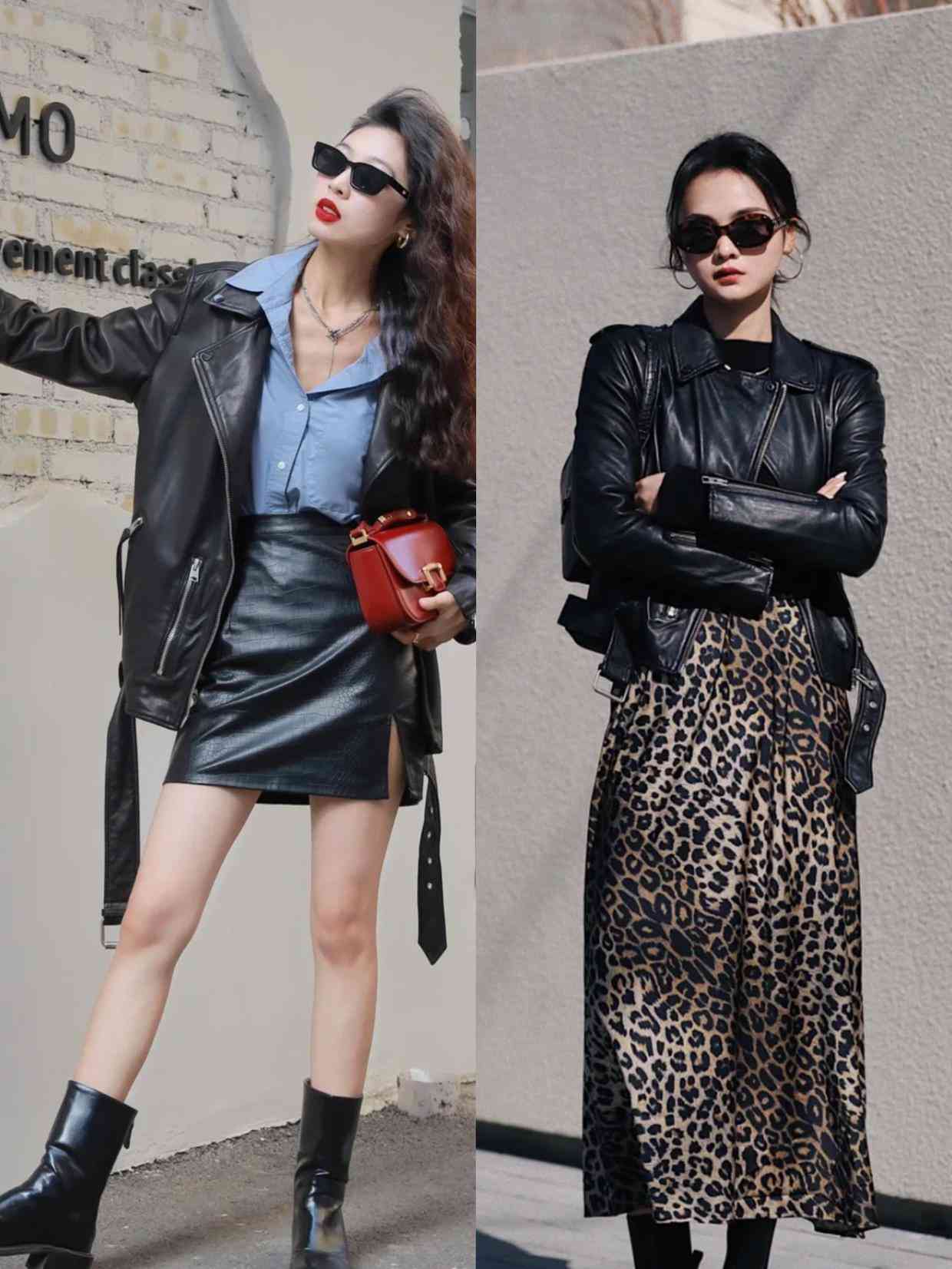 而且皮衣的搭配风格也很多样化,除了酷帅风,大家还可以配上裙子,像这种温柔的半身裙配上一件皮衣外套可盐可甜,同时也很性感,豹纹半身裙或者是皮革半身裙都可以来和皮衣对比。