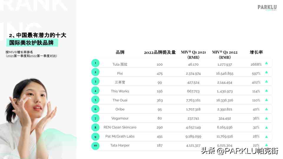 在中国十大最有潜力的国际美妆品牌中,排名.的是TULA图拉,是一个旨在以益生菌提取物和有效成分为双向驱动,采用突破性创新和尖端配方的美国益生菌护肤品牌。该品牌去年在中国市场的MIV®增长迅猛,2022年.季度与2021年.季度相比增长了2668%。这个美国品牌通过2022年.季度的100篇提及品牌的发文中创造了127万元的MIV®。TULA与近400名KOL合作,成为了.个推出“打击负向自我对话”活动的品牌,且该活动在社交媒体上被广泛传播。